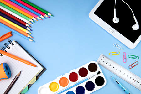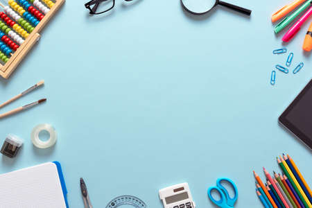 School supplies and stationery.Back to school concept. Frame with various colored stationery. copy space.Teaching children primary school.stationery for the study of mathematics and the alphabet