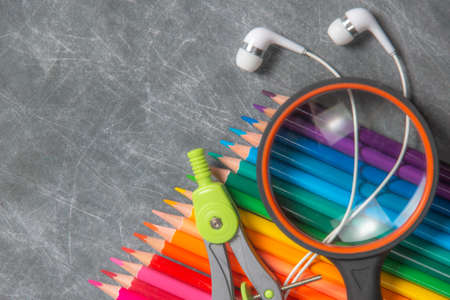 Concept of school or start of activities, office objects seen from above on a desk, pencil tips under a magnifying glass, a compass above a notebook and tips of visible colored crayons.