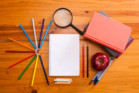 Back to school. Items for the school on a wooden table background and notebook space for text