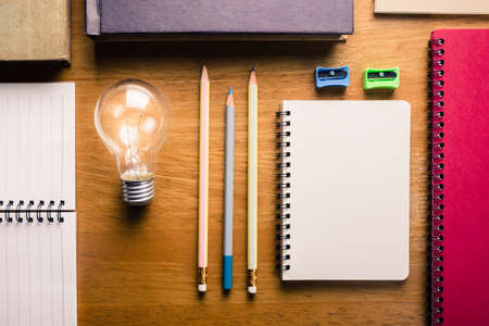 Many notebooks with pencils, sharpeners and glowing light bulb on wood table