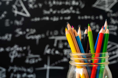 multicolored school supplies lie on black chalkboard, short focus, partial blur