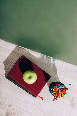 high angle view of whole apple on books near pen holder with stationery on desk near green chalkboard