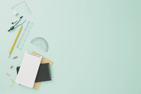 Creative arrangements of stationery on pastel pale blue background. Top view or flat lay. Education concept. Office desk with copy space.