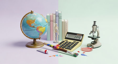 School background with stationery accessories. Books, globe, pencils and various office supplies lying on the desk on a green blackboard background.