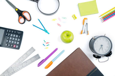 Close up of organic green apple with school supplies on the table. Isolated on white background