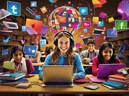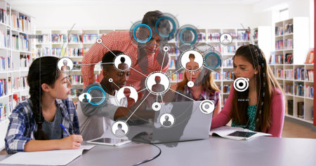 Pointing teacher guiding students around laptop in classroom, with social media icons. Education, collaboration, digital learning, youth, mentorship, modern, engagement