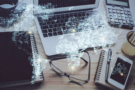 Double exposure of business theme hologram over desktop with phone. Top view. Mobile international trade connection concept.