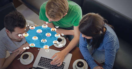 Caucasian people looking at laptop with social network interface and drinking coffee. home background conceptdigitally generated image