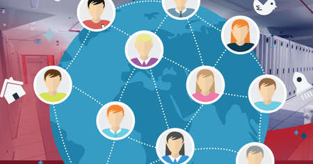 Network of profile icons over globe and server room against red technology background. global networking and business technology concept