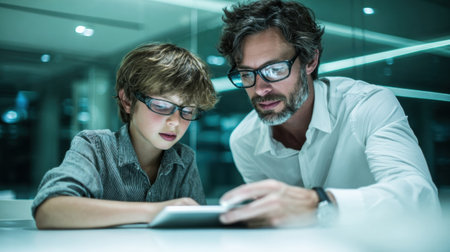 A father and son engage with a tablet, focusing intently on a shared learning experience in a well-lit office setting during evening.