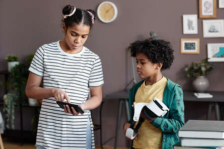 African girl helping her little brother to connect smartphone with VR goggles while they standing in room