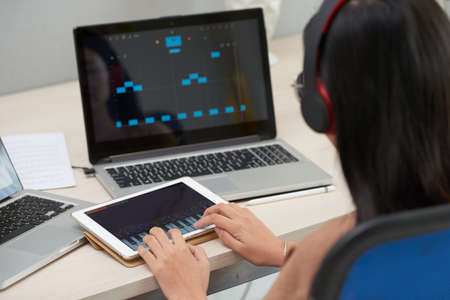 Crop back view of brunette female in headphones sitting at desk with laptop and tablet and learning to play piano with special teaching apps