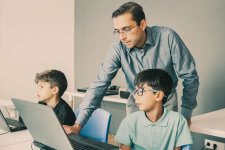 Middle-aged content teacher helping to boy with lesson and explaining theme. Young pupil in glasses looking at laptop computer screen and listening man. Childhood and digital education concept