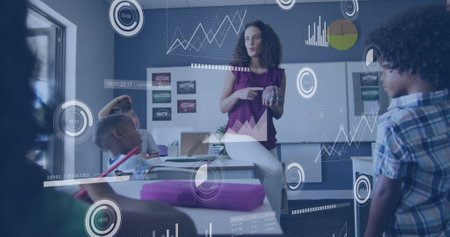 Image of data processing over diverse schoolchildren and teacher using tablets in classroom. Global education, computing and digital interface concept digitally generated image.