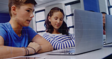 Image of caucasian students studying using laptop in classroom over stock trading board. Digital composite, multiple exposure, investment, finance, education, childhood, e-learning, technology.