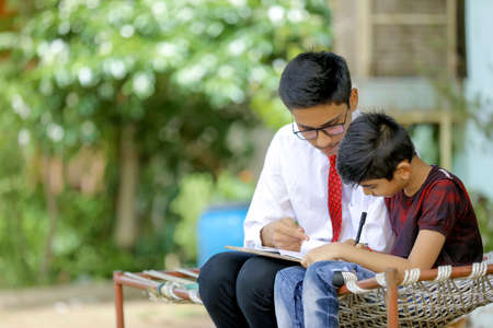 Indian Asian school boy with note book and studying at home