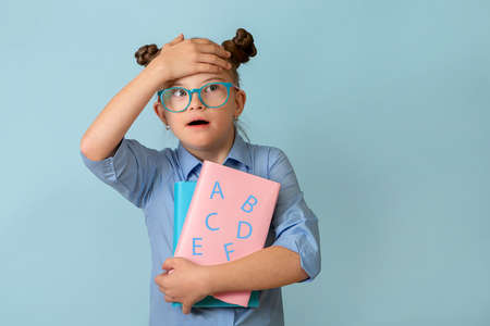Happy girl with Down syndrome having fun in the studio with books