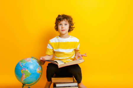 A small schoolboy prepares for studies.Isolated studio portrait