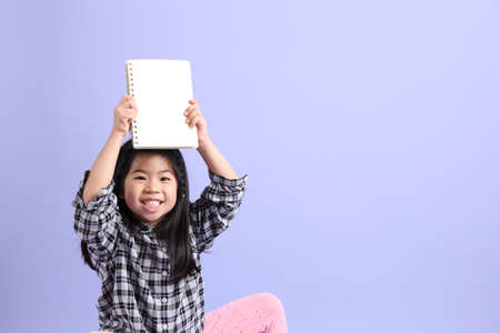 The young Asian gril standing on the purple background.