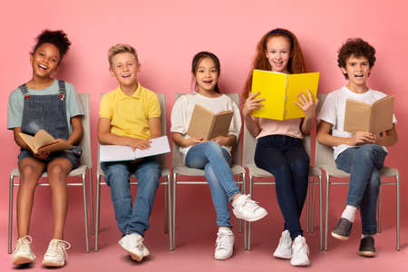 School education concept. Happy diverse kids with textbooks and notebooks sitting on chairs against pink background