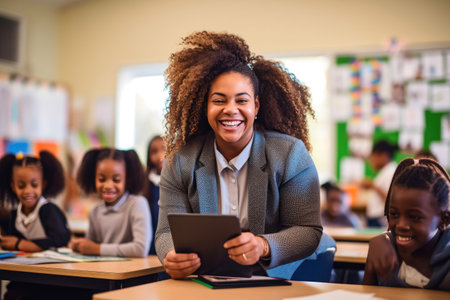 Smiling Teacher with Diverse Students Engaged in Learning Activities in a Bright Classroom Setting