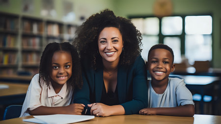 Portrait of an american african teacher in classroom, alone posing concept, happy new job work