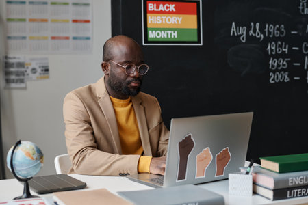 African American teacher in eyeglasses concentrating on his online work, he sitting at table and working on laptop in the classroom