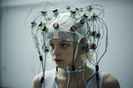Cuttingedge futuristic brain interface experiment, a hightech neural connection technology with wires. Electrodes. And ai for closeup brainwave monitoring and healthcare diagnostics