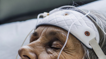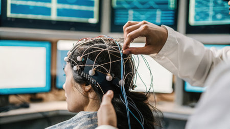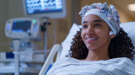 A patient is monitored with EEG equipment, offering detailed analysis of brain activity in a clinical setting. Generative AI
