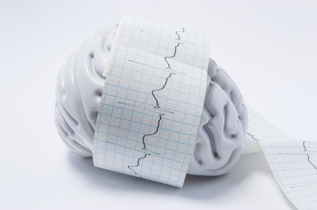 Concept of brain exam as ECG waves. Shape of human brain entwined with paper tape elektrokardiogrammy wave, which displays process of brain research in neuroscience or medical exam to detect diseases