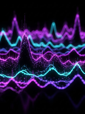 Digital visualization of sound waves with vibrant colors and dynamic peaks, creating energetic and modern atmosphere. This abstract representation evokes sense of movement and rhythm