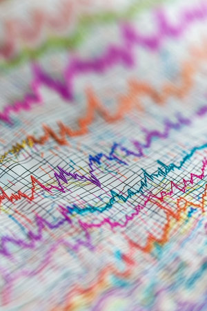 Colorful, Abstract Lines and Curves Intertwined on Grid Background Visualizing Data and Trends