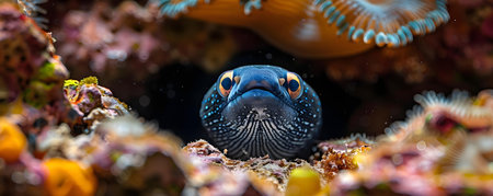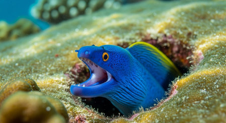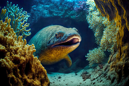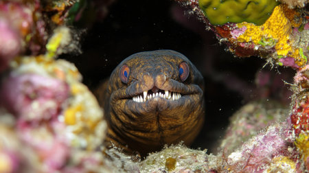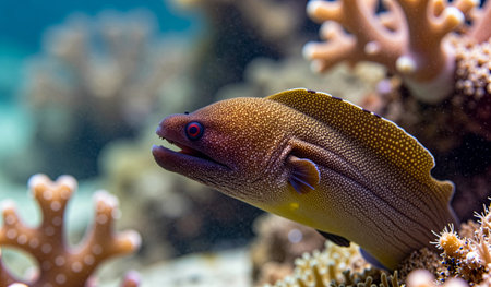 A captivating view of a moray eel emerging from its coral habitat. This underwater scene showcases the vibrant marine life and intricate details of nature.
