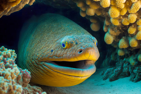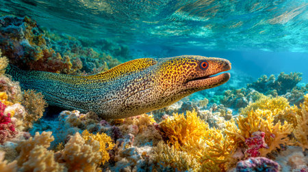 Vibrant moray eel emerges from coral reef in crystal clear turquoise tropical waters, showcasing stunning yellow spotted pattern and intricate marine ecosystem biodiversity.