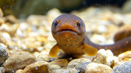 A mesmerizing close-up view of a fish swimming gracefully among smooth pebbles and stones in a clear river environment, showcasing intricate details.