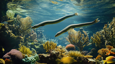 Two eels glide gracefully through a vibrant coral reef teeming with diverse marine life in this stunning underwater scene, showcasing nature's beauty.