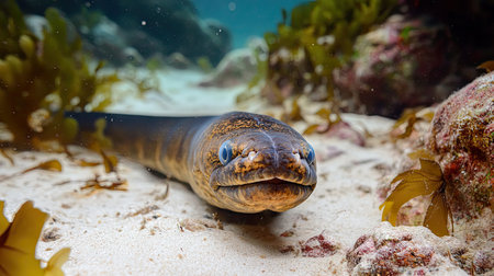 A captivating underwater image showcasing an eel in its natural habitat, surrounded by vibrant coral and seaweed, capturing the beauty of marine life.
