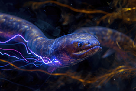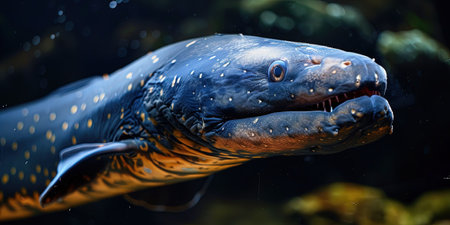 A detailed shot capturing the close-up view of a fish with a blurred backdrop, A surreal vision of an Electric Eel generating streaks of electricity in the dark, AI Generated