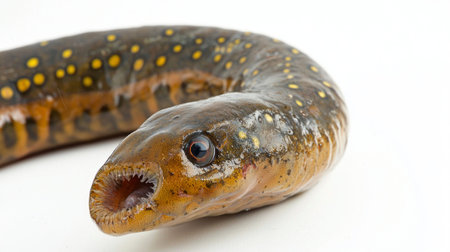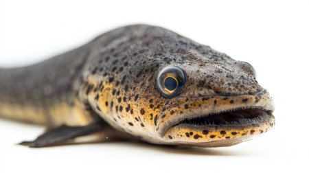African lungfish is prominently displayed against a white background highlighting its unique anatomy and textures in a natural setting.