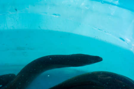 Tropical sea fish, living in coral reefs, close-up head of moray eel behind glass of marine aquarium with salt water.