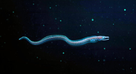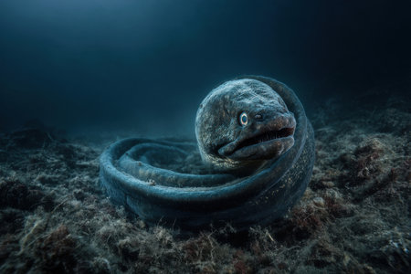 a hagfish coiled along ocean floor, mouth slightly open, surrounded by decaying organic matter, murky water atmosphere, Generative AI