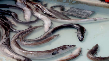 Close up of Alive Eel (Carling) in a Tray full of Water at the Italian Market on Blurred Background