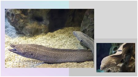 Moray eels are very strong and dangerous sea creatures, deadly for divers. Collage of two images with space for your text.