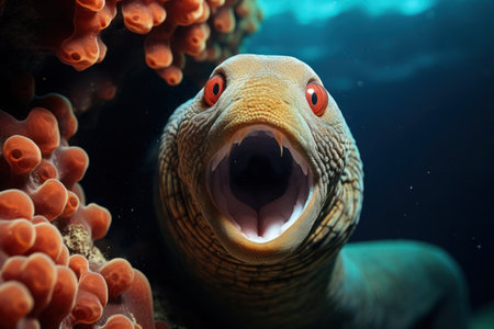 Moray eel has opened its mouth wide and is preparing to attack its prey.