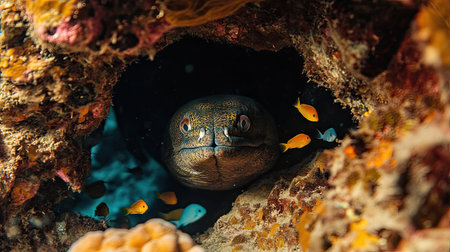 A dramatic underwater shot of a moray eel peeking out from a coral cave, surrounded by small fish.