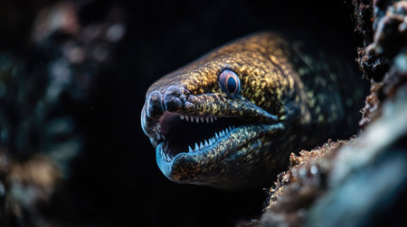 A dramatic shot of a moray eel peeking out from its rocky hiding place, its sharp teeth visible.