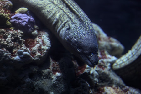 Moray eel coming out of a rock in the tank of an aquarium seen up close