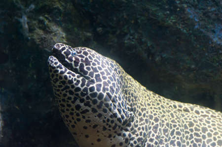 Gymnothorax favagineus or laced moray fish swimming out of its hiding place