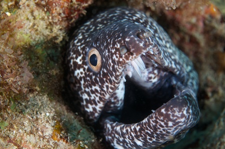 The whitemouth moray {Gymnothorax meleagris} is easily distinguished from other moray eels by its white mouth and distinctive spots.