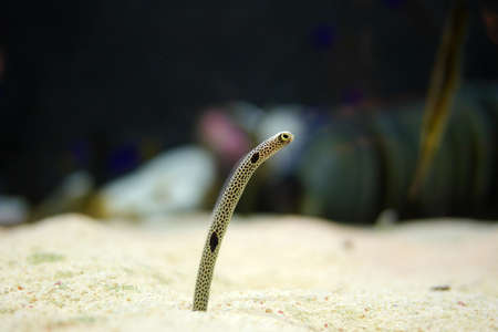 Spotted garden eel of aquarium with anemone in coral reef. Heteroconger hassi species of family Congridae living in Indo-Pacific seas, from Red Sea to Polynesia and Australia